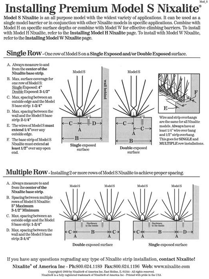 Premium Model S Nixalite is our stainless steel, full row bird control spike that deters all pest birds and climbing animals, in all infestation levels and on all types of installation surfaces. It repels ALL birds including pigeons, seagulls, sparrows, starlings, swallows, black birds, crows, and vultures. Combine with Premium Model W spikes to deter all types of climbing animals including squirrels, raccoons, cats, rodents and even snakes! Blunt Tip option is available.
