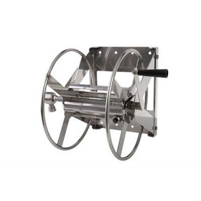 Stainless Steel Hose Reel; Heavy Duty wall mount reel. All 304SS construction. Stainless steel fittings and swivel. Holds 150` of 5/8" or 100` of 3/4" garden hose. Shipped unassembled. 102-255.