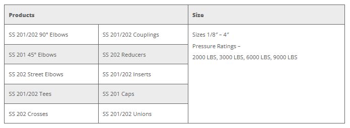 Reliable Pipes and Tubes Ltd. is a leading manufacturer and exporter of stainless steel 201 grade and stainless steel 202 grade buttweld pipe fittings, forged fittings and flanges. RELIABLE PIPES & TUBES LTD. offers a complete range of stainless steel 201/202 pipe fittings such as SS 201/202 reducer, SS 201/202 elbow, SS 201/202 tee, SS 201/202 cross, SS 201/202 stub ends and SS 201/202 pipe bends. Stainless steel 304 and 304L pipe fittings are manufactured in compliance with ASTM A-403 and ANSI B16.9 / 16.28/ MSS SP-43 / Welding Bevel Standards ANSI B 16.25. Stainless steel 201 and 202 austenitic chromium-nickel-manganese alloys are a lower cost alternative to commercially used Cr-Ni stainless steels such as 301 and 304. Type 201 (1% Nickel) and Type 202 (4% Nickel) stainless steel can be used in moderately corrosive environments. These grades are widely used as a substitute to 304 grade stainless steel in India, for many moderate corrosion environments.