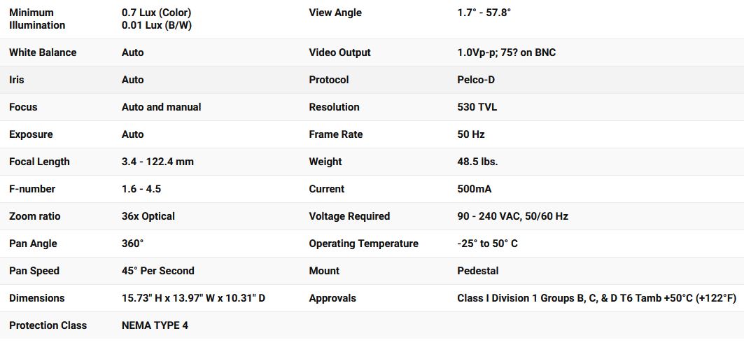 The APTZ-3045-04 is a high quality, high-resolution color video camera with outstanding low-light performance. It has a 36x motor-driven optical zoom. This PTZ camera is a high-performance, low-light camera that automatically switches to black and white and removes an IR cut filter to increase sensitivity in low light conditions. The camera is housed in a stainless-steel enclosure certified for Class I Division 1, groups B, C, and D. IP connection requires a separate encoder.