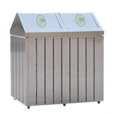 This is a 2-compartment stainless steel recycling station features vertical strip design and closure that prevents rain drops, birds and spreading smells.