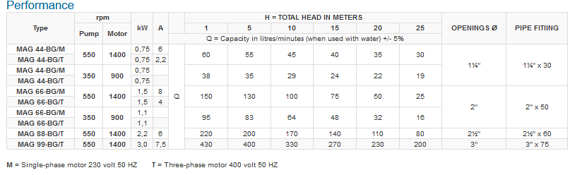 The main feature of these pumps is their strenght, due to the process throught which they are manufactured, that is to say stainless steel casting. The total absence of junctions or welding give to the material a high resistance to abrasion and corrosion. They feature thick walls (4-5 mm) and smooth surface. Mag pumps are suitable for whatever industrial sector and they are suitable for trasferring liquids gently without emulsifyng the product. Instant priming up to 4 - 5 meters. Pumping works in both directions of rotation. Suitable for thick liquids containing floating bodies. Mechanical seal is supplied according to the product to be pumped. The pumps are coupled to the electric motor in compliance with CE standard.