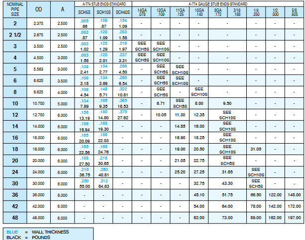 Manufactured in accordance to ASTM A-774 specifications. Sizes larger than 48" and special lengths are available upon request. OD and wall thickness are given in inches. Manufactured to MSS dimensions.