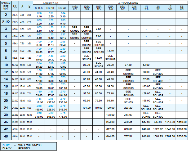Manufactured in accordance to ASTM A-774 and A-403 CR specifications. Sizes larger than 48" are available upon request. OD and wall thickness are given in inches.