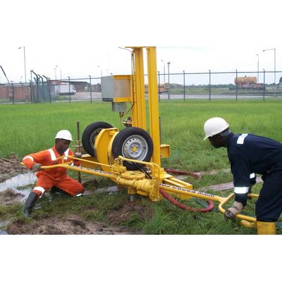 The CPT penetrometer set comes with a specially designed, two men operated hydraulic wrench for quick and effective placing of the ground anchors. The rotary drive (torque 1700 Nm) is mounted in the centre of the reaction arm of this hydraulic wrench. The wrench can be manoeuvred freely around the pusher and the ground anchors can be placed at that spot that suits the operator best.
