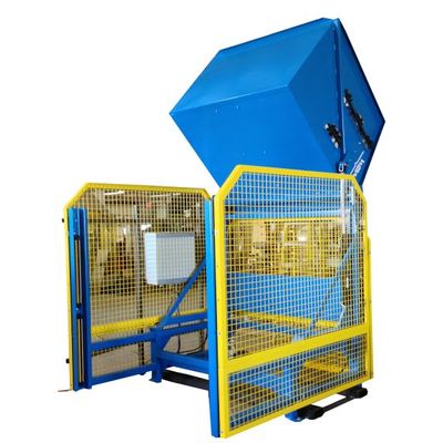Our standard conventional bin dumper is perfect for any basic application. As standard it is supplied with a hand operated control mounted directly on the side of the dumper. It is made to handle 48” wide boxes 36” – 48” tall with a simple adjustment. This dumper is available in sizes to feed hoppers from 50” high and up. Larger hoppers may require the dumper to be mounted on a sub frame to raise it up. Our standard single bin dumper can be custom made to suit any size box.
