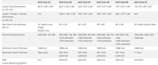 - AUV 20/25/30 and 40" models are UV coaters available with and without feeders and stackers; AUV 25/30/40 have a touch screen control panel