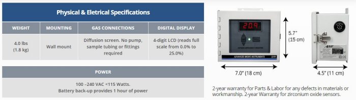 - Alarms: 2 preset oxygen concentration alarms. Preset for OSHA standards23.5% Danger. Dry contacts 3A. @24VDC/115VAC.