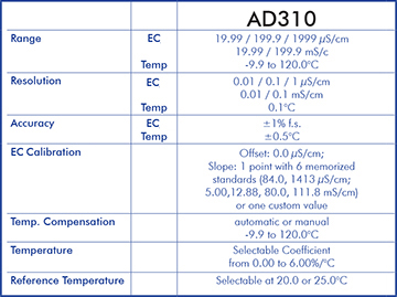 AD310 is a portable microprocessor-based instrument for measuring EC and temperature. The autoranging feature of the EC and automatically sets the instrument to the scale with the highest resolution. Measurements are compensated for temperature effect automatically (ATC) or manually (MTC). The temperature compensation feature can also be disabled to measure actual conductivity. The temperature coefficient is user selectable. The instuments also feature a measurement stability indicator.