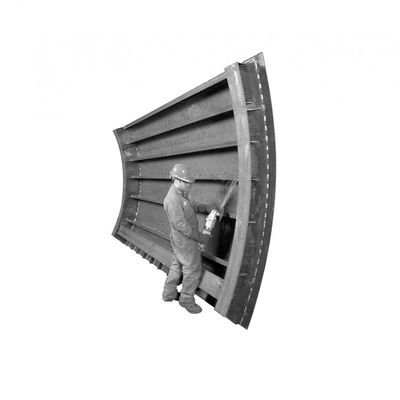 Hydro Gate’s standard radial gate is designed for a wide, clear waterway opening. A radial (or taintor) gate acts similar to a section of a drum. Pressure is transferred from the curved face through the horizontal support beams to the radial arms at the sides of the opening. The arms act as columns and transfer thrust to a common bearing located on either side of the gate opening. Flow is underneath the curved face as the gate is opened. This design results in a lightweight, economical gate that can be opened and closed with minimum effort and with comparatively small number of turns of the handwheel on the hoist.