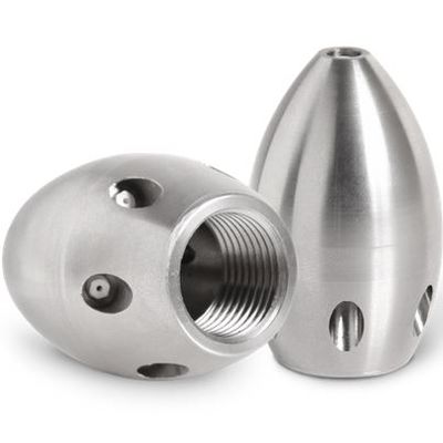 Sewer and tube nozzles made of stainless steel feature long service life, excellent cleaning characteristics, and high traction. The special egg-shape is tailored to the sewer bottom and makes these nozzles the ideal tool to clean building tie-ins.