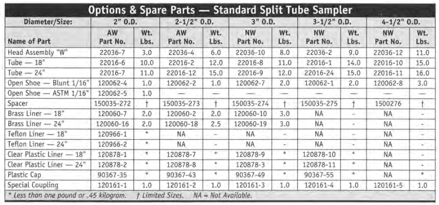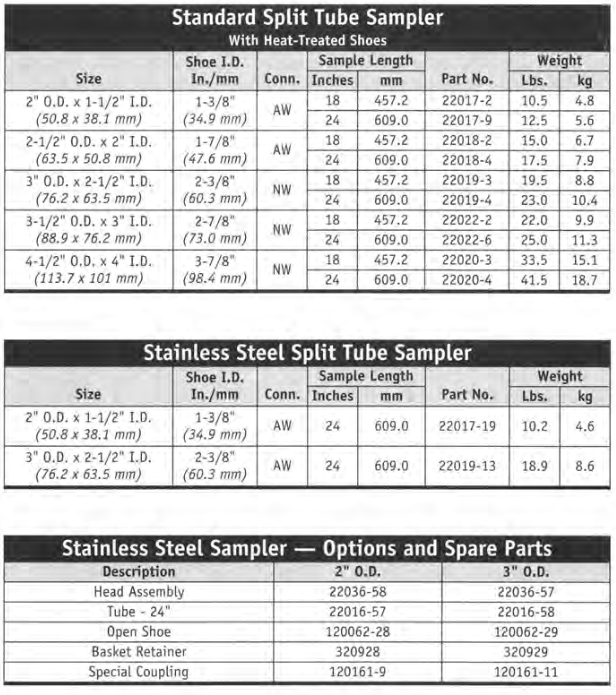 This split tube sampler is designed for taking soil samples at the bottom of the cleaned bore hole by the drive weight method. The split section is held together with a ball check head and a hardened steel drive shoe. The ball check feature in the head prevents samples from being washed out of sampler upon withdrawal from the hole. The sampler is designed to accommodate a brass, plastic or paper tube liner for collecting and carrying samples to the field office. Two sample lengths are available. Note steps in tube design...Acker`s Heat Treated Drive Shoe is recessed to accommodate various accessories.