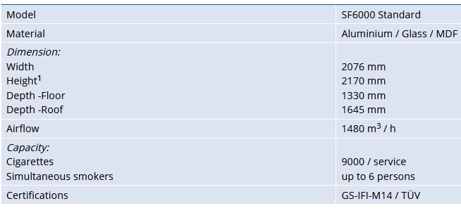 The SF-Line currently has two sizes, the SF4000 and the SF6000. The smaller SF 4000 has a capacity 10–15 regular smokers, whereas the SF6000 have a capacity of 20–30 regular smokers