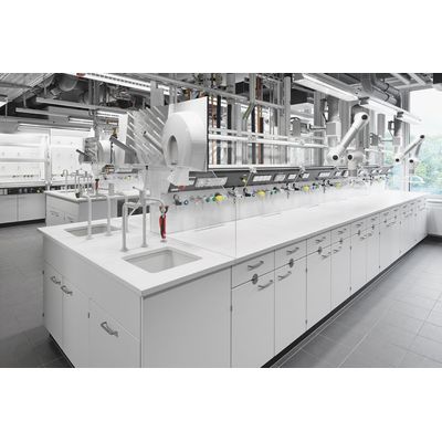 The standing unit for the double workbench provides a clear view and at the same time meets the requirements for occupational safety in the laboratory with the integrated splash protection.