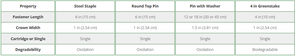 Installation of Rolled Erosion Control Products (RECPs) requires the use of staples, stakes, pins or other anchoring devices. As a convenience, Western Excelsior can provide appropriate fasteners as an-add on for Western Excelsior RECPs orders or separately. Staples are available as single staples in boxes. Biodegradable stakes are also available for a completely biodegradable installation.