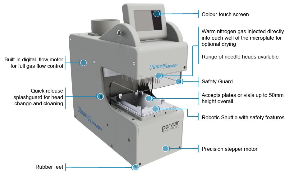 The Ultravap® Levante, an ideal starter evaporator for efficient concentration of samples, is one of the latest state of-the-art evaporators from Porvair Sciences. It offers greater control and flexibility for sample preparation workflows. This standalone instrument is designed to consistently and reproducibly evaporate solvents from samples. Precisely engineered to ANSI/SLAS standards, the Ultravap® Levante is designed to securely fit all microplate formats and tube/vials racks up to 45 mm in height. The Ultravap® Levante can be operated from a gas cylinder or in-house supply of nitrogen or clean dry air.