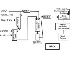 “NPOC” (Non-Purgeable Organic Carbon) mode is preferred for accuracy when no volatile organics are in the sample. The injector delivers the sample and acid to the sparger, where it is mixed to lower its pH to approximately 2.0. At this pH, the inorganic carbon in the sample is converted to dissolved CO2 and is stripped (sparged) from the sample by air/O2 and vented to atmosphere, along with any purgeable/volatile organics. The carbonate-free sample is drawn from the sparger and delivered to the Reactor, where the remaining NPOC is oxidized to CO2, which is measured by the NDIR (Non-Dispersive Infrared Analyzer) as a direct correlation of NPOC in the sample. NPOC is often erroneously reported as “TOC”.