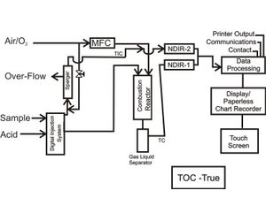 TOC-True mode is the preferred method of use if any volatile hydrocarbons are present in the sample, which would be lost in the Inorganic Carbon removal sparging stage in an “NPOC” analysis. The TOC-True method measures both TC (Total Carbon) and TIC (Total Inorganic Carbon) for a more accurate and complete analysis of the total organics in the sample, including the purgeable/volatile organic carbon. By subtracting the TIC from the Total Carbon in the sample, all species of organic carbon are detected, not just the NPOC.