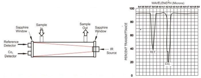 Automatic gain control (AGC) is employed during the reference/sample cycle to compensate for such factors as IR source deterioration, dirty optical windows, and detector gain changes. When the AGC level reaches a predetermined threshold, an optics alarm indicator and a relay are activated. Malfunctions of major IR components are detected as an alarm, providing fail-safe operation. Signal detection is completely synchronous, and , because of the differential technique of ratioing the Zero and CO2 outputs, zero drift is virtually eliminated. All critical optics are protected by sapphire windows. The sample cell can be easily removed and the windows cleaned within 3 minutes, without realignment or the use of any tools.