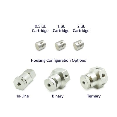 Flow rate range: 100 nL/min. to 5 μL/min. This kit contains 0.5 µL, 1 µL, 2 µL cartridges and 1 housing you select. 3 cartridges are interchangeable and fit in all Micro Flow Series In-line, Binary tee and Ternary tee housings. You may swap 3 cartridges until you define the right volume for your application. By using this kit, you will be able to reduce your development cost not only because of the benefit of interchangeable cartridges but also because we offer the reduced price as a kit. Besides that, you may interchange the cartridges when your requirement changes. High Temperature rating above 40°C is available.