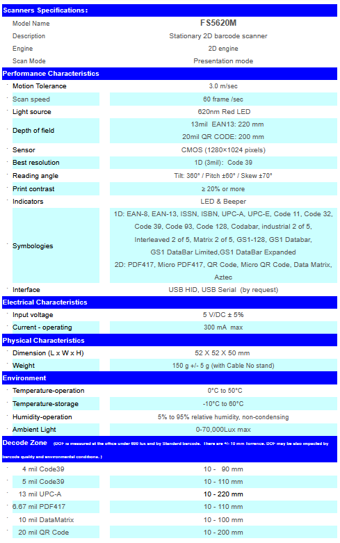 The FS5620M represents the premium level of data collection devices. Using advanced 2D imaging technology, FS5620M 2D stationary barcode reader provides a solution for OEM use into self-service kiosks, price checker, ticket readers, document handling, as well as vending machines. Designed for easy integration, the FS5620M 2D stationary barcode scanner provides a plug-and-play solution for system designers. The FS5620M features outstanding reading, high motion tolerance, snappy reading, and also offers excellent performance on tiny barcodes. With unique stand, FS5620M becomes hand-free 2D barcode scanner.