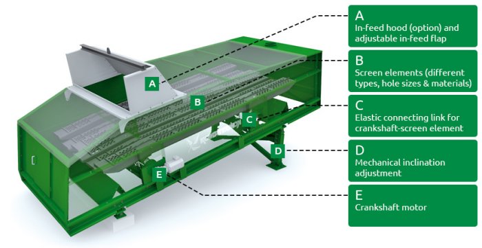 Screening plates in various designs, perforation (30/50/60/80 mm) and material texture, central lubrication crankshaft bearing, automatic grease cups connecting rod bearing, fixed or manual inclination, in-feed hood, tarpaulin cover and more