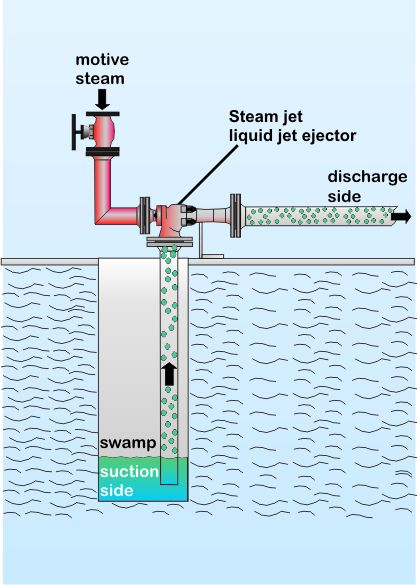 Water vapour as motive medium is used to suck and transport liquids.