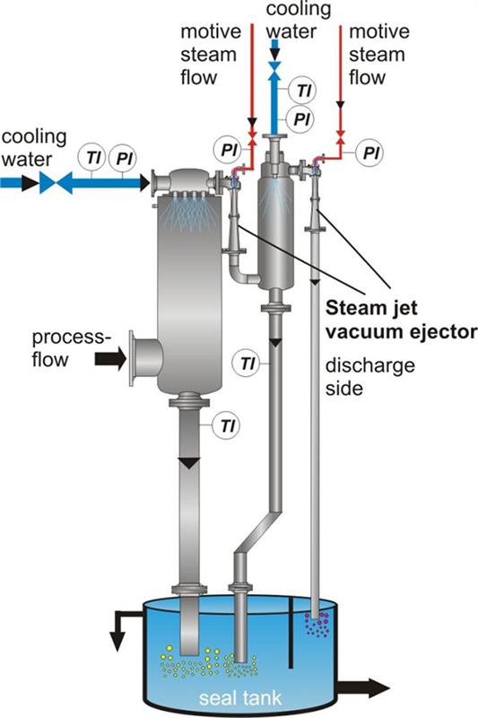 Steam jet vacuum pumps remove gases and/or vapours from process operations thereby generating a vacuum in the reactor. The suction flow is compressed to a higher pressure.