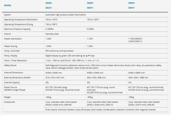 Yamato -Â Model SM201/211/301/311/501/511 -Steam Sterilizer with Dryer