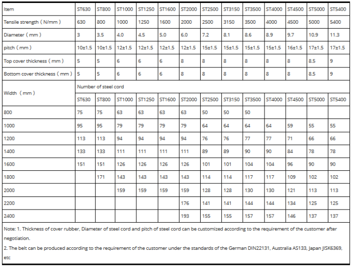 Technical data: The steel cord conveying belt has the general used, high abrasion, cold-resistant and flame-retardant according to the using requirement and the performance of the cover rubber.
