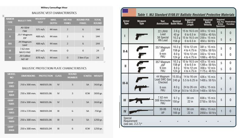 Ballistic Protection Vests are manufactured in protection class IIIA generally and they can be raised to class III or IV protection in the regions of the plates by adding a Ballistic Protection Plate. Ballistic Protection Plates are manufactured according to American NIJ0101.04 and NIJ0101.06 standards and tested against bullets at the threat levels determined at high level ballistic test laboratories.
