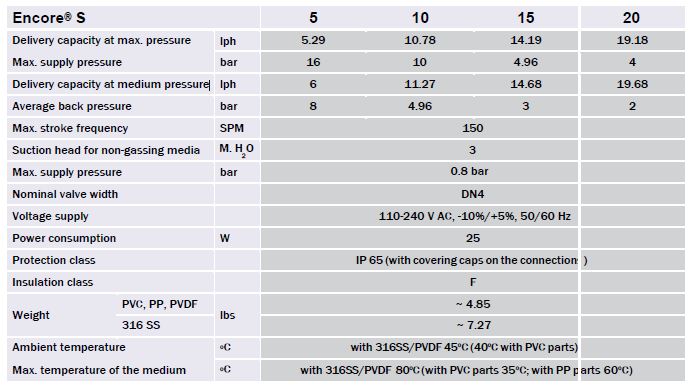 The Encore S is available in four sizes for metering applications ranging to 19.68 lph against pressures of up to 16 bar.