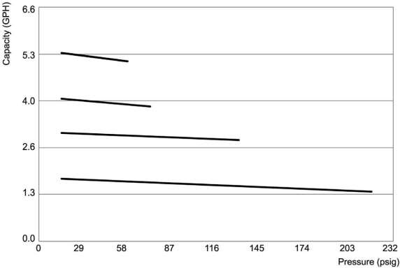 The flow curves are valid for 20°C (68°F) for water at 100% stroke frequency. The delivery capacity depends on the medium (density and viscosity) and temperature.