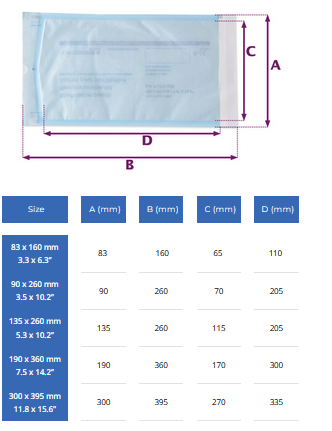 Content remains always visible through PET / CPP transparent laminated film. Never use a damaged pouch. Blue stained film enables easy control of pouch integrity. Medical grade 60 g/m² paper provides high mechanical resistance.
