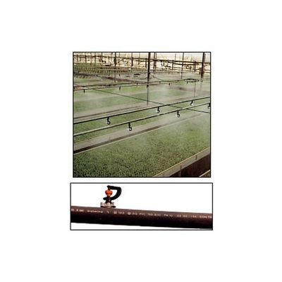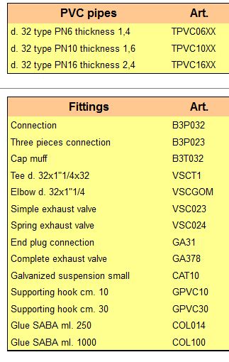 Sticking unions, Unions with metal ring that can be dismantled. Bars have threaded holes for inserting the nozzle, with pitch from 0,50mt to 3mt and 3/8 w thread; other screw threads on demand. A great variety of specific PVC unions, anchor hooks, anti-dripping valves, plugs are available. There are many types of nozzles, which are provided together with bars, each of them with a specific application.
