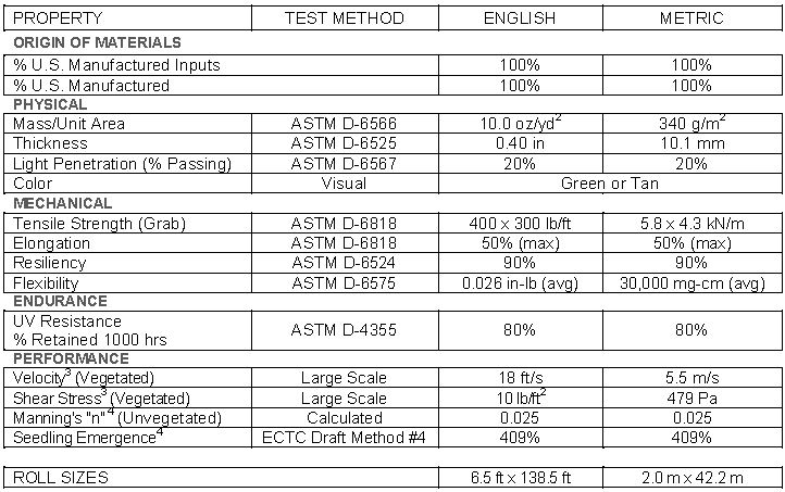 - Maximum permissible velocity and shear stress has been obtained through vegetated testing programs featuring specific soil types, vegetation classes, flow conditions, and failure criteria. These conditions may not be relevant to every project nor are they replicated by other manufacturers. Please contact Propex for further information.