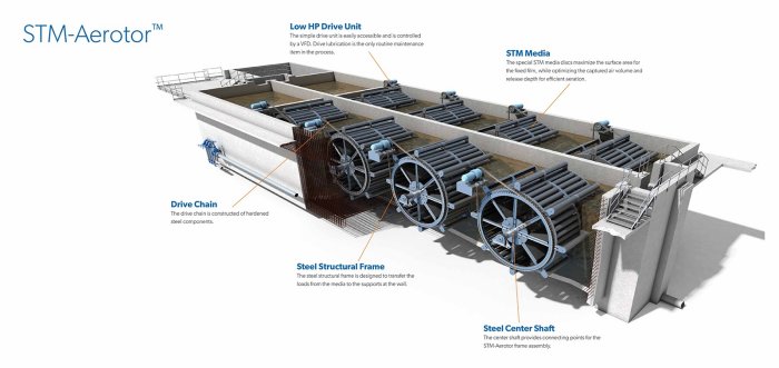 IFAS process systems have been employed for wastewater treatment because they have many distinct advantages. First, the IFAS process can accomplish more treatment than conventional activated sludge in an existing footprint. Second, complete nitrification occurs at much lower sludge ages than conventional activated sludge plants. Finally, the improvement in sludge settling makes operation of an IFAS plant much easier. Most IFAS systems use a free-floating or structurally supported media in a diffused aeration basin, but the STM-Aerotor does not. The STM-Aerotor has all the advantages of the IFAS process without the need for energy intensive diffused aeration or mixing equipment.