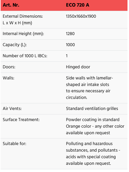 The standard models are equipped with air vents, single or twin hinged doors, built-in certified spill containment pallet.