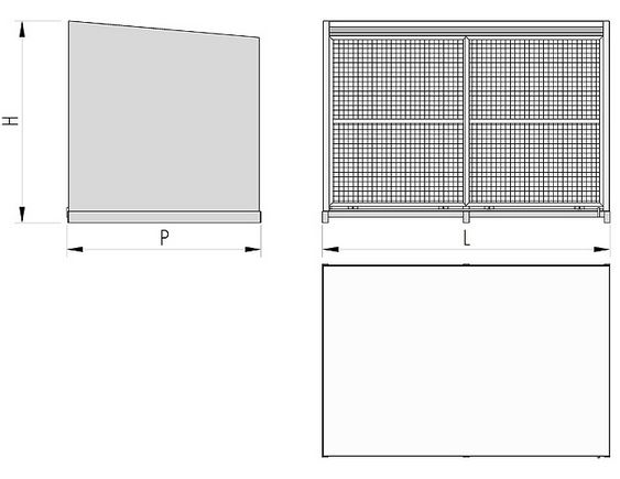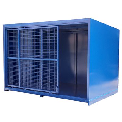 Storage container for temporary stock of cylinders and compressed gas cans. The container is made in assembled robust carbon steel-made parts. The product has also a continuous ground system (Faraday cage). The front part for material entry/exit, consists of two sliding doors made in safety carbon steel net. The net allow also a natural and simple circulation of air inside the container, avoiding potentially dangerous gas accumulation. The two sliding doors have a safety locking system to prevent unauthorized personnel to have access to the container. The product belongs to deposit/storage box category so it is not necessary any authorization toinstall and use it, even if it is anchored to the soil. The container in the figure can store about 50 cylinders; it can be made in different dimensions (larger/smaller) under request.