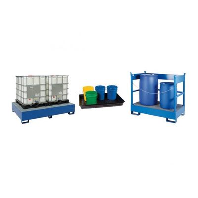 Collecting trays made of sheet steel. Collection trays made of plastic. Collecting trays for IBC storage. Steel barrel cabinets. Hazardous goods cabinets. Shelving systems.