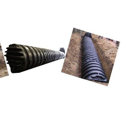 The connection of pods is very easy. Simply push two pods together so the ribs interlock. The pipe spigots at the base of both pods must be fully inserted into the sealed couplings. This will create a clear vertical channel through which a steel securing pin is inserted, locking the pods together (illustrated in red). A continuous sealed structure with a 300mm diameter moulded storm channel along the full length of its base is formed, allowing for rodding and maintainance.