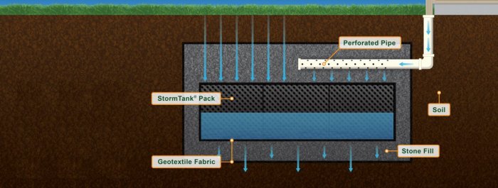 Stormwater runoff enters the StormTank Pack system by means of infiltration or through a perforated pipe. Once the runoff hits the Pack, it spreads across the media surface and is evenly distributed to the base where it either permeates into the soil or collects for rainwater harvesting.