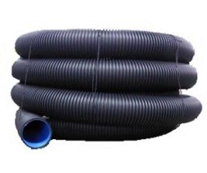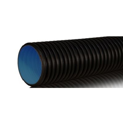 Material: PP (Polypropylen). Ring stiffness: SN8 / 10. Receivable in nominal diameters ID 150, 200, 250, 300, 400 and 500. In accordance with DIN 4262-1 . Colour: outside black, inside blue. Cellular design - smooth on inside, corrugated on outside. With double socket and one sealing ring at each spigot end. Pipe length (without joint): approximately 6 m.