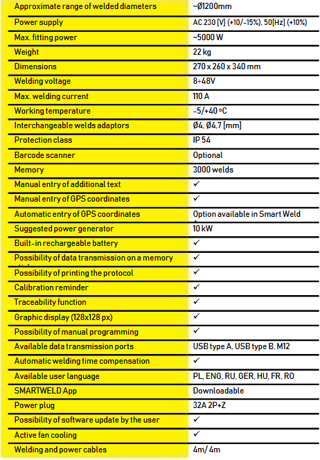 The device supports fittings used in the plumbing and gas industry. It allows four programming modes: manual, scanner, barcode manually, as recently. The welder`s aluminium housing and built-in fan facilitate transformer cooling. It comes with a plywood transport box, which protects against mechanical damage and guarantees convenient transportation and storage of the device. Simple and clear way to connect a barcode scanner (equipment option). Transformer temperature measurement system protects the welder from overheating.