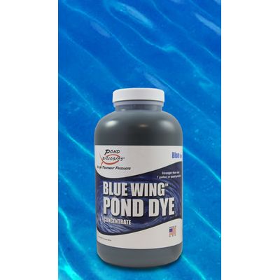Blue Wing™ is a straight blue, highly concentrated water dye. Blue Wing™ shades and protects, while adding a natural color and an aesthetic appeal to your pond or lake. This powerful Pond Dye Concentrate is stronger than any one gallon product available on the market today and will treat up to 1 surface acre 4-6 feet deep.