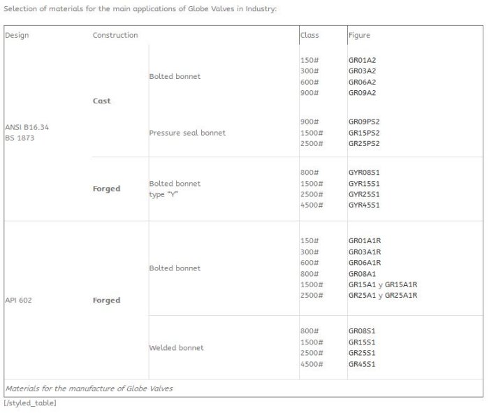 Ringo Válvulas globe valves are supplied with all material types to fulfill all the different combinations of service fluid, design pressure and temperature. Valves can be supplied either forged or casted based on customer specifications. Following materials are under the scope of supply of Ringo: