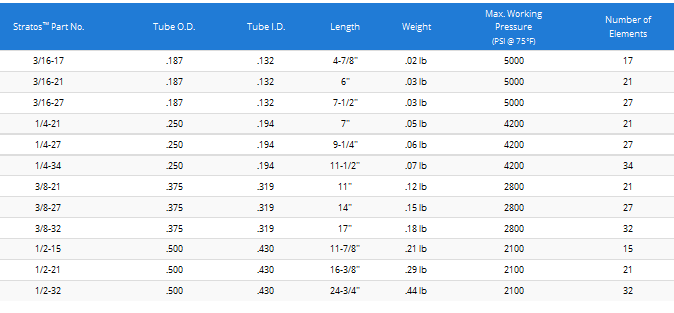 The Koflo Stratos Static Tube Mixer consists of a series of fixed alternating right and left hand helical mixing elements designed for mixing light viscosity to high viscosity components. Both the elements and housing are constructed of 316L SS for superior performance. Mixing elements are fixed by either 316L stainless steel TIG welds (1/4", 3/8", 1/2" tube mixers) or a silver braze (3/16" tube mixer only). Stratos Static Tube Mixers come in a variety of sizes and lengths, depending on viscosity and whether the blended products are of similar or dissimilar physical characteristics.