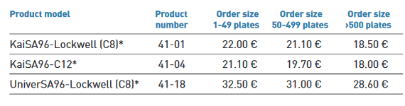 KaiSA96 is our flag-ship product for ELISA assays and widely used by several diagnostic companies. Plates are available off-the-shelf as Lockwell (C8, breakable to single well use) and C12. Other plate types are available on request.