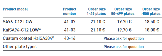 The plates listed here are manufactured regularly but are not always available off-the-shelf. SA96 is a passively coated streptavidin plate. KaiSA96-C12 LOW is a low background plate for time-resolved fluorometry-based assays. KaiSA384 plates are suitable for HTS applications. In addition, several other plate types are available as custom orders.