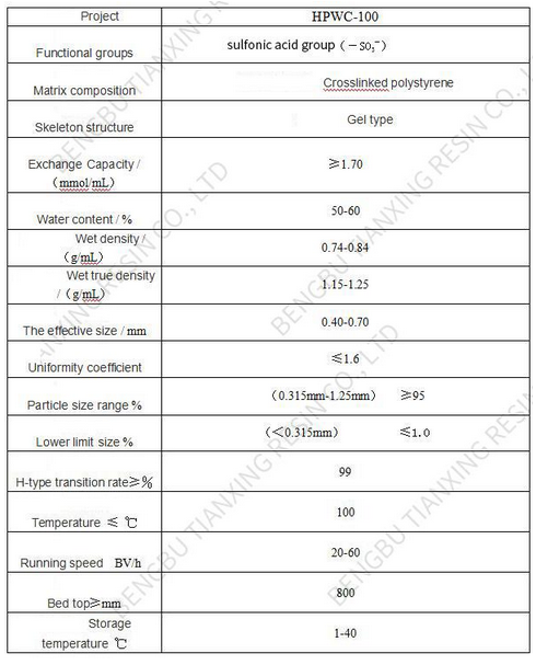 HPWC-100 resin is a gel having a structure that type strong acid cation exchange resins. After special purification treatment and a high degree of transformation, with high exchange capacity and good physical and chemical stability. Hydrogen cation exchange bed HPWC-100 resin for high purity water system and with HPWA-200 resin mixed bed system, the pure water system for reverse osmosis and mixed bed ion exchange pure water system and power plant condensate the field of preparation of high water, has a good application effect. The H + form of the resin transition rate is high, the exposure will absorb carbon dioxide in the air for a long time, thus affecting the performance and the use of the product. Once open the package as soon as possible, not required to be carefully sealed. In addition, the product is not subject to direct sunlight or exposure.